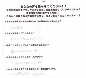 こちらでは、痛みの原因をとても分かりやすく説明してもらえたので安心できました。先生も優しく、こちらの話をしっかり聞いてくれます。